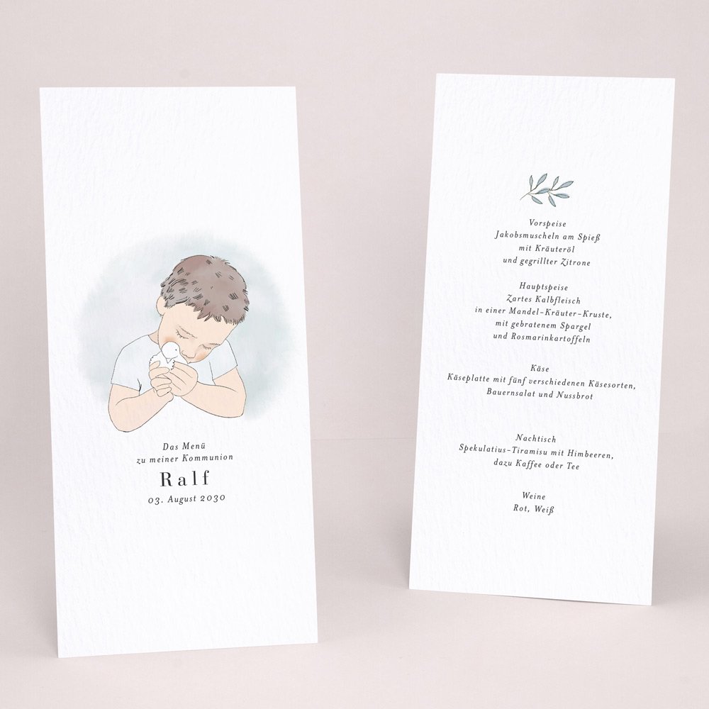 Lassen Sie Ihr Gäste wissen, welche kulinarischen Genüsse sie bei der Kommunionsfeier erwarten! Gestalten Sie informative Menükarten, im passenden Design zu Ihren Einladungskarten und Ihrer Tischdeko.