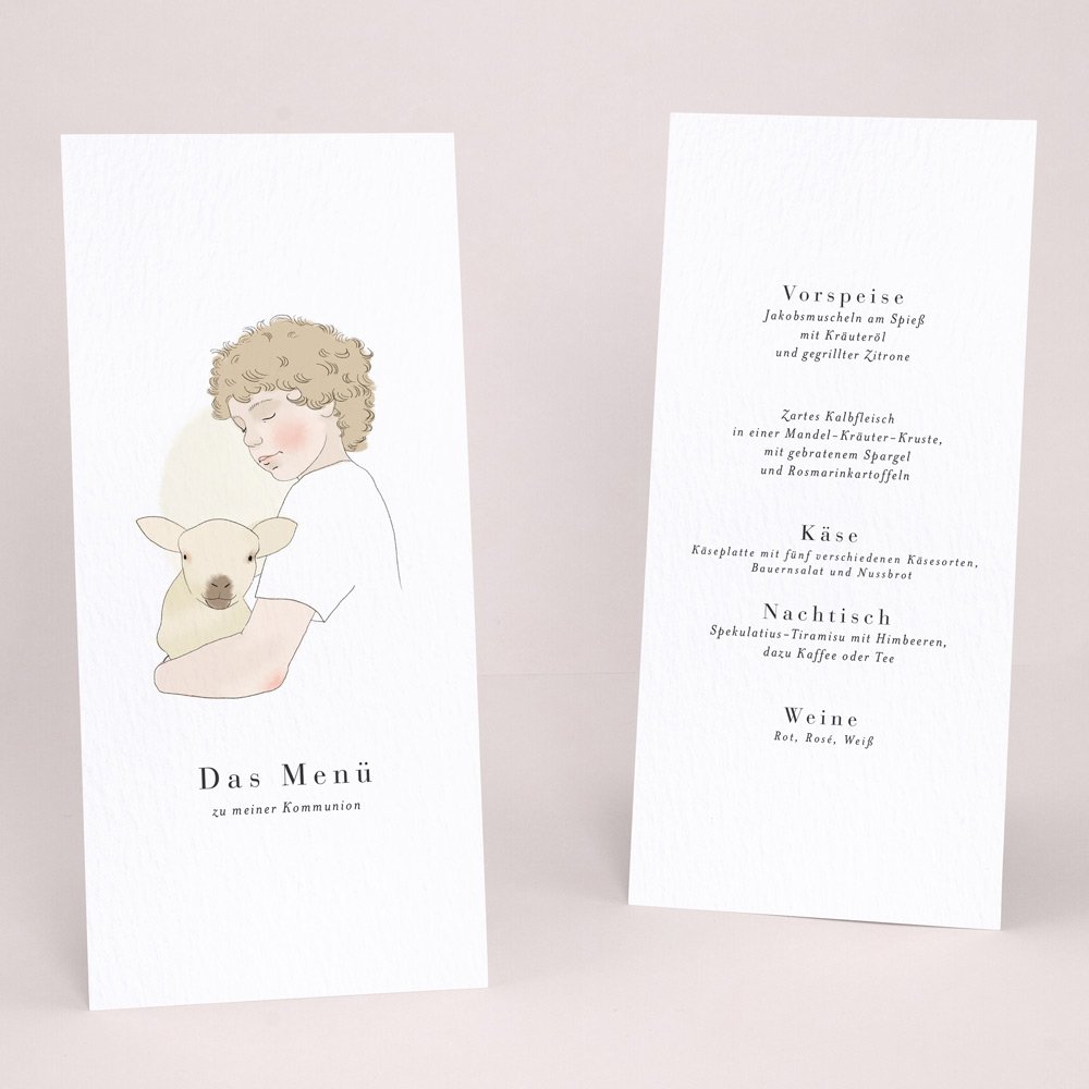 Lassen Sie Ihr Gäste wissen, welche kulinarischen Genüsse sie bei der Kommunionsfeier erwarten! Gestalten Sie informative Menükarten, im passenden Design zu Ihren Einladungskarten und Ihrer Tischdeko.