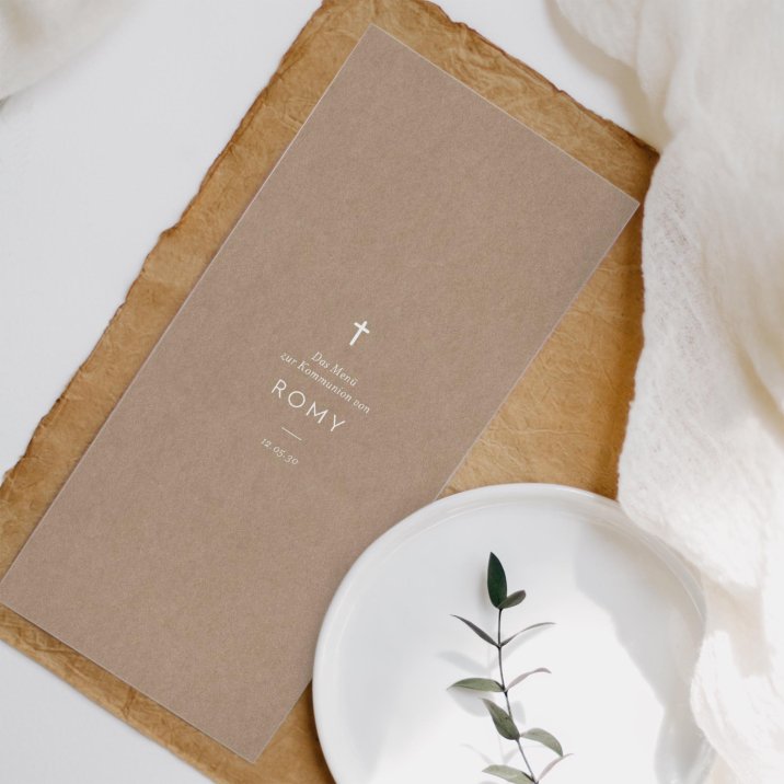 Lassen Sie Ihr Gäste wissen, welche kulinarischen Genüsse sie bei der Kommunionsfeier erwarten! Gestalten Sie informative Menükarten, im passenden Design zu Ihren Einladungskarten und Ihrer Tischdeko.