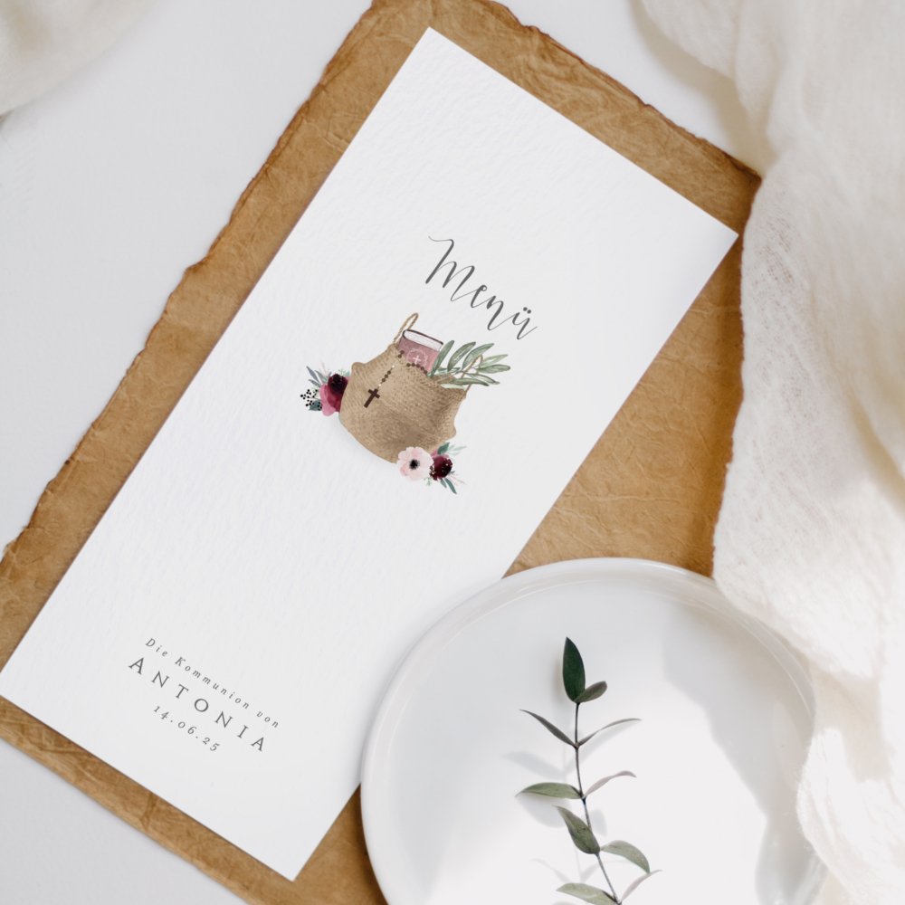 Lassen Sie Ihr Gäste wissen, welche kulinarischen Genüsse sie bei der Kommunionsfeier erwarten! Gestalten Sie informative Menükarten, im passenden Design zu Ihren Einladungskarten und Ihrer Tischdeko.