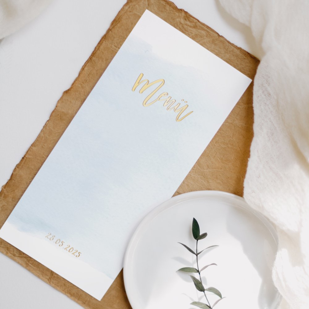 Platzieren Sie die Menükarten entweder pro Sitzplatz oder pro Tisch und vervollständigen Sie so die Deko Ihrer Feier.