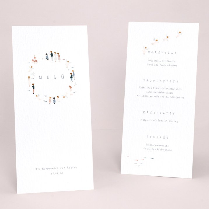 Lassen Sie Ihr Gäste wissen, welche kulinarischen Genüsse sie bei der Kommunionsfeier erwarten! Gestalten Sie informative Menükarten, im passenden Design zu Ihren Einladungskarten und Ihrer Tischdeko.