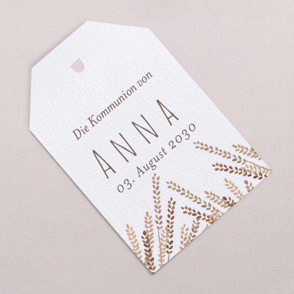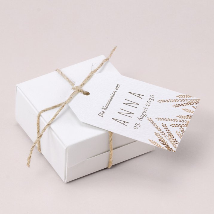 Vervollständigen Sie kleine Geschenke für Ihre Kommunionsgäste mit personalisierbaren Geschenkanhängern.