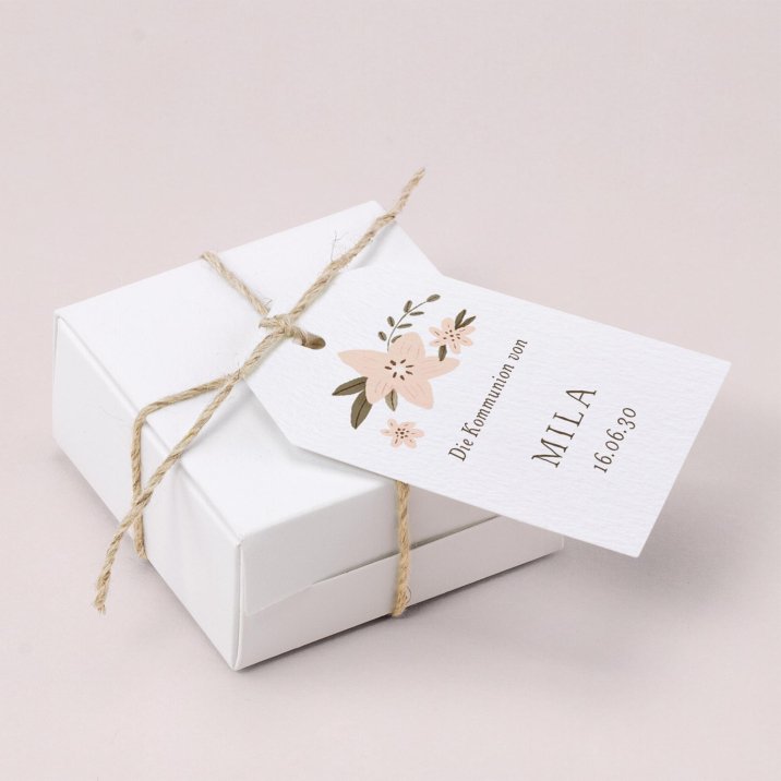 Vervollständigen Sie kleine Geschenke für Ihre Kommunionsgäste mit personalisierbaren Geschenkanhängern.