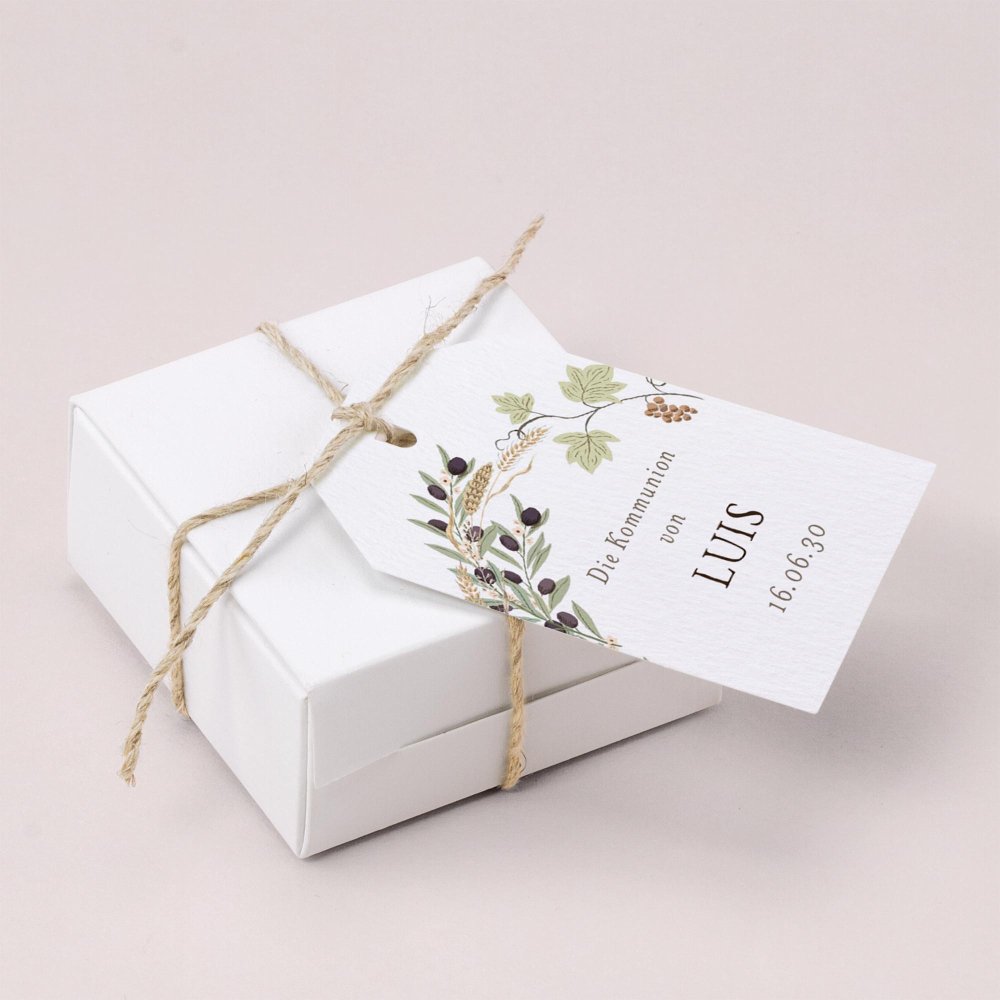 Vervollständigen Sie kleine Geschenke für Ihre Kommunionsgäste mit personalisierbaren Geschenkanhängern.