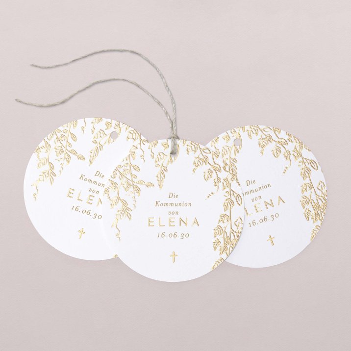 Dekorieren Sie kleine Geschenke für die Gäste Ihrer Kommunionsfeier mit diesen personalisierbaren Geschenkanhängern. Die hübschen runden Anhänger eignen sich hervorragend, um kleine Präsente, Geschenkboxen und andere Aufmerksamkeiten zu personalisieren.