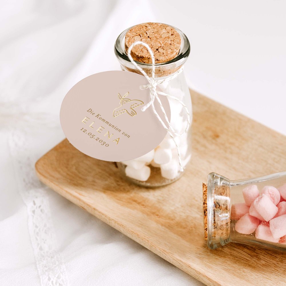 Dekorieren Sie kleine Geschenke für die Gäste Ihrer Kommunionsfeier mit diesen personalisierbaren Geschenkanhängern. Die hübschen runden Anhänger eignen sich hervorragend, um kleine Präsente, Geschenkboxen und andere Aufmerksamkeiten zu personalisieren.