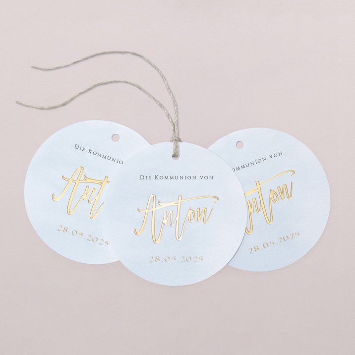 Dekorieren Sie kleine Geschenke für die Gäste Ihrer Kommunionsfeier mit diesen personalisierbaren Geschenkanhängern. Die hübschen runden Anhänger eignen sich hervorragend, um kleine Präsente, Geschenkboxen und andere Aufmerksamkeiten zu personalisieren.