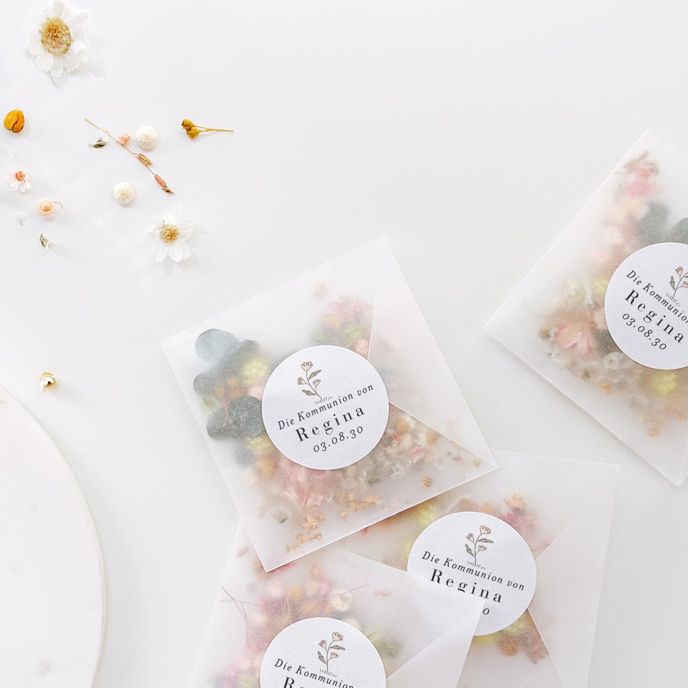 Bekleben Sie die Briefumschläge der Einladungskarten, Danksagungen oder kleine Geschenke mit unseren Stickern. Die Aufkleber lassen sich in wenigen Handgriffen mit dem Namen Ihres Kindes und dem Datum der Kommunion gestalten.
