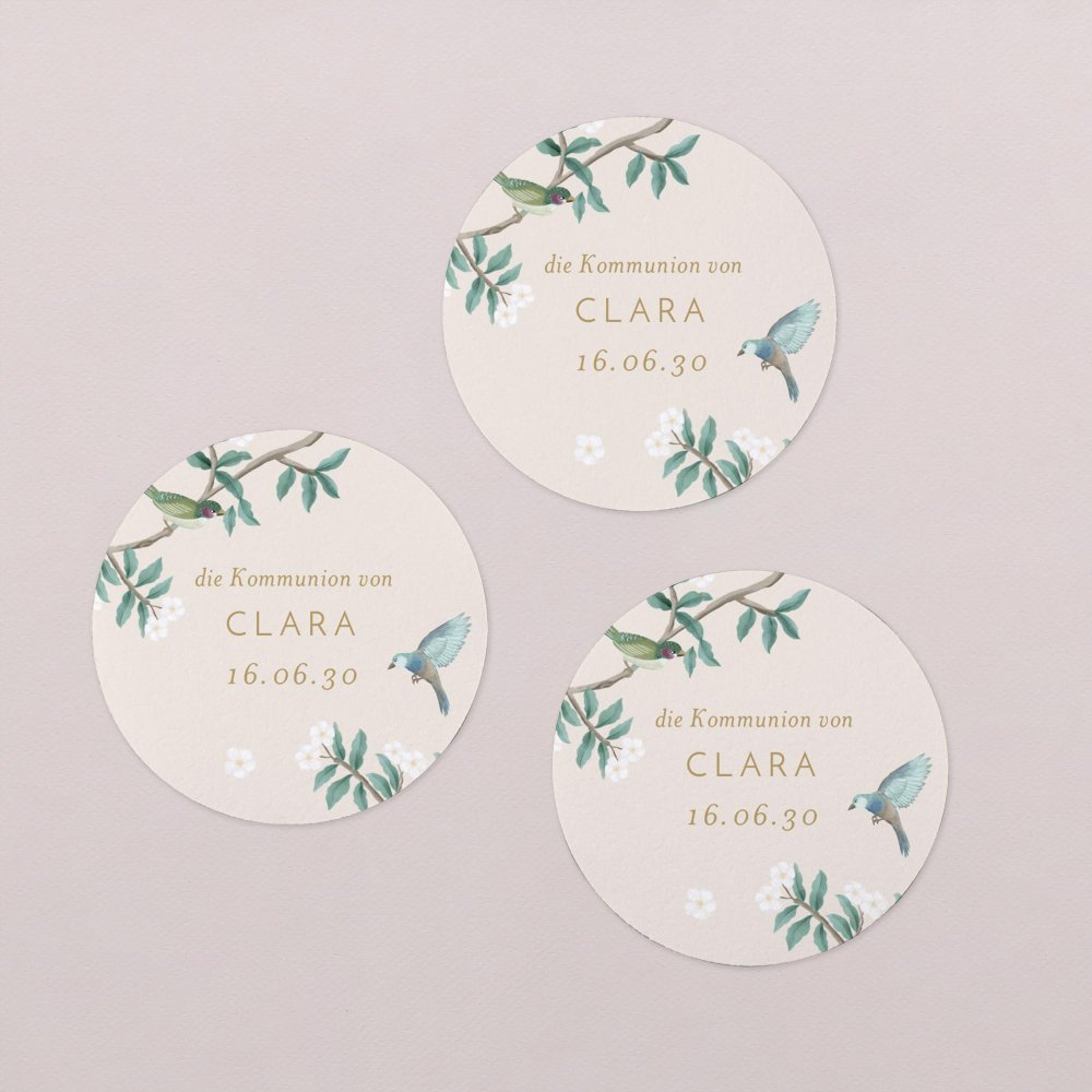 Runden Sie Ihre Papeterie und Deko mit den passenden Aufklebern ab! Mit dem Namen des Kommunionkindes und einer persönlichen Notiz gestaltet, können Sie mit den großen runden Aufklebern die verschiedensten Artikel schmücken: Briefumschläge, Geschenke, Marmeladengläser, Kerzen, und vieles mehr...!