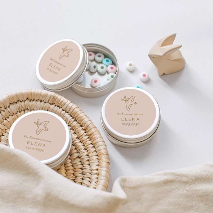 Runden Sie Ihre Papeterie und Deko mit den passenden Aufklebern ab! Mit dem Namen des Kommunionkindes und einer persönlichen Notiz gestaltet, können Sie mit den großen runden Aufklebern die verschiedensten Artikel schmücken: Briefumschläge, Geschenke, Marmeladengläser, Kerzen, und vieles mehr...!
