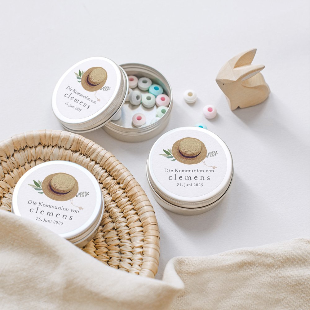 Runden Sie Ihre Papeterie und Deko mit den passenden Aufklebern ab! Mit dem Namen des Kommunionkindes und einer persönlichen Notiz gestaltet, können Sie mit den großen runden Aufklebern die verschiedensten Artikel schmücken: Briefumschläge, Geschenke, Marmeladengläser, Kerzen, und vieles mehr...!