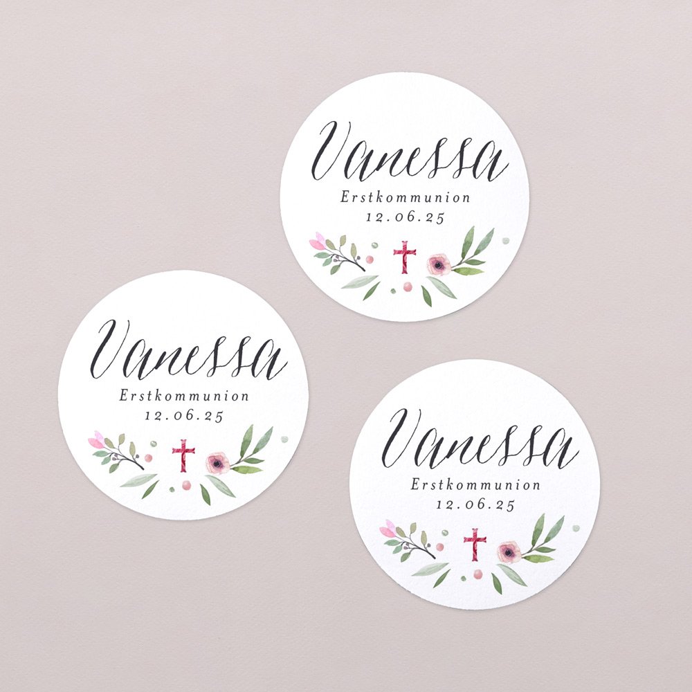 Runden Sie Ihre Papeterie und Deko mit den passenden Aufklebern ab! Mit dem Namen des Kommunionkindes und einer persönlichen Notiz gestaltet, können Sie mit den großen runden Aufklebern die verschiedensten Artikel schmücken: Briefumschläge, Geschenke, Marmeladengläser, Kerzen, und vieles mehr...!