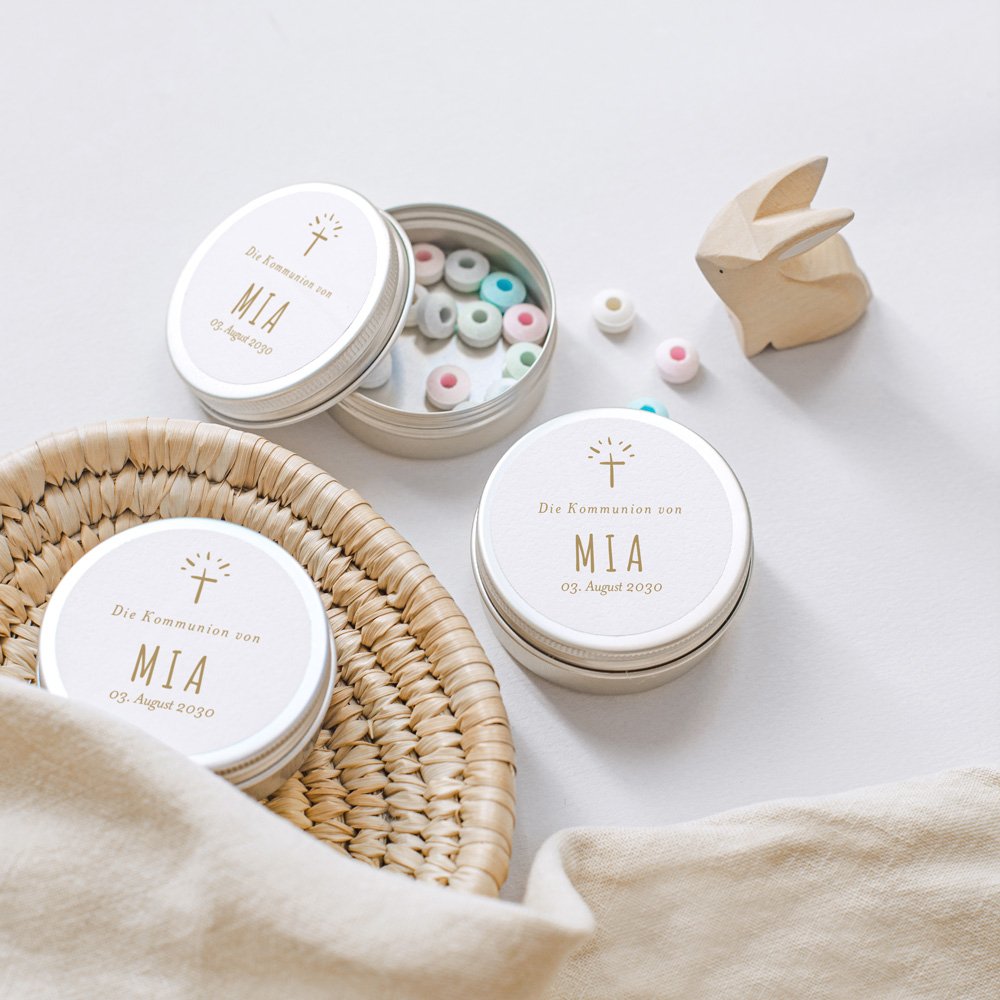 Runden Sie Ihre Papeterie und Deko mit den passenden Aufklebern ab! Mit dem Namen des Kommunionkindes und einer persönlichen Notiz gestaltet, können Sie mit den großen runden Aufklebern die verschiedensten Artikel schmücken: Briefumschläge, Geschenke, Marmeladengläser, Kerzen, und vieles mehr...!