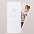 Diese Danksagung hat es in sich: die Klappkarte im Hochformat beinhaltet einen Fotostreifen mit Platz für 3 Ihrer schönsten Kommunionsfotos. Der Streifen kann als Andenken in der Karte aufbewahrt werden, aber auch herausgenommen und an den Kühlschrank gepinnt oder als Lesezeichen genutzt werden.
