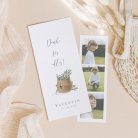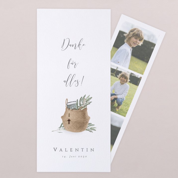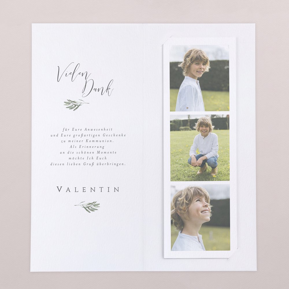 Diese Danksagung hat es in sich: die Klappkarte im Hochformat beinhaltet einen Fotostreifen mit Platz für 3 Ihrer schönsten Kommunionsfotos. Der Streifen kann als Andenken in der Karte aufbewahrt werden, aber auch herausgenommen und an den Kühlschrank gepinnt oder als Lesezeichen genutzt werden.