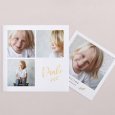 Diese Danksagung hat es in sich: die Klappkarte im Hochformat beinhaltet einen Fotostreifen mit Platz für 3 Ihrer schönsten Kommunionsfotos. Der Streifen kann als Andenken in der Karte aufbewahrt werden, aber auch herausgenommen und an den Kühlschrank gepinnt oder als Lesezeichen genutzt werden.