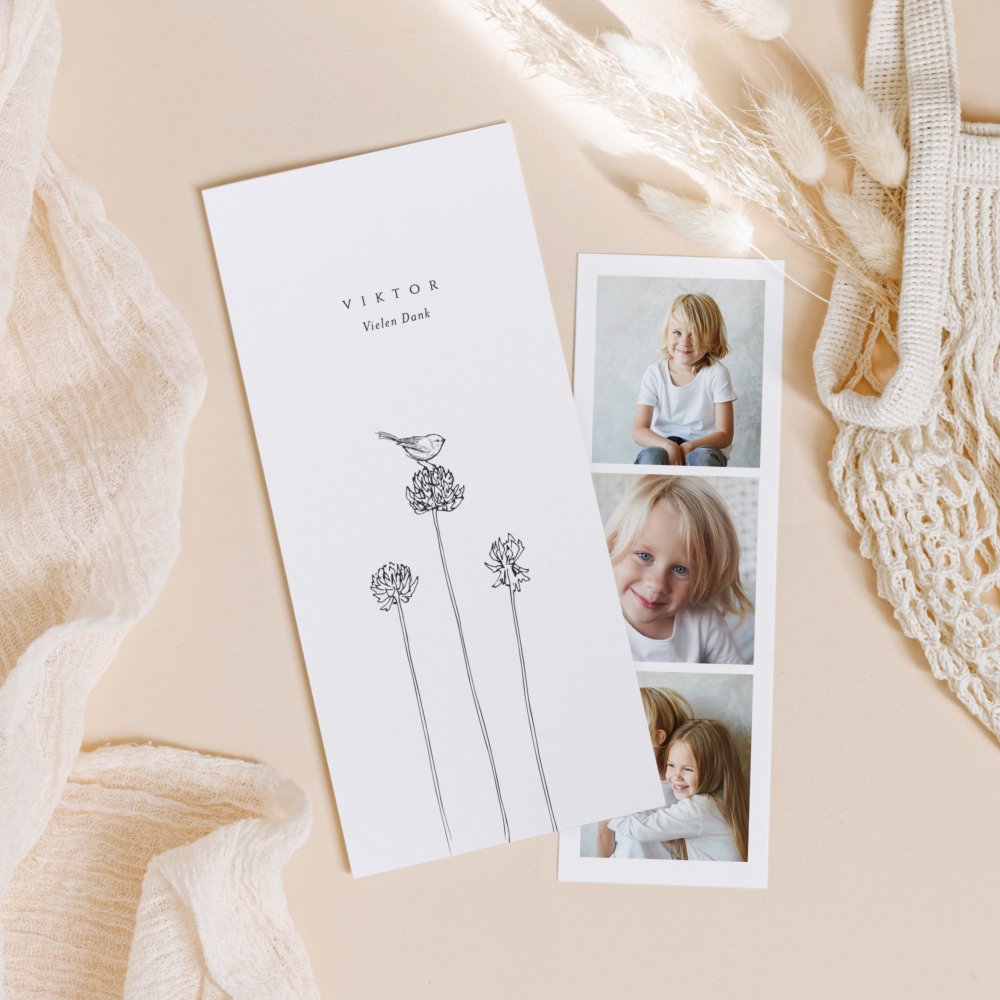 Diese Danksagung hat es in sich: die Klappkarte im Hochformat beinhaltet einen Fotostreifen mit Platz für 3 Ihrer schönsten Kommunionsfotos. Der Streifen kann als Andenken in der Karte aufbewahrt werden, aber auch herausgenommen und an den Kühlschrank gepinnt oder als Lesezeichen genutzt werden.