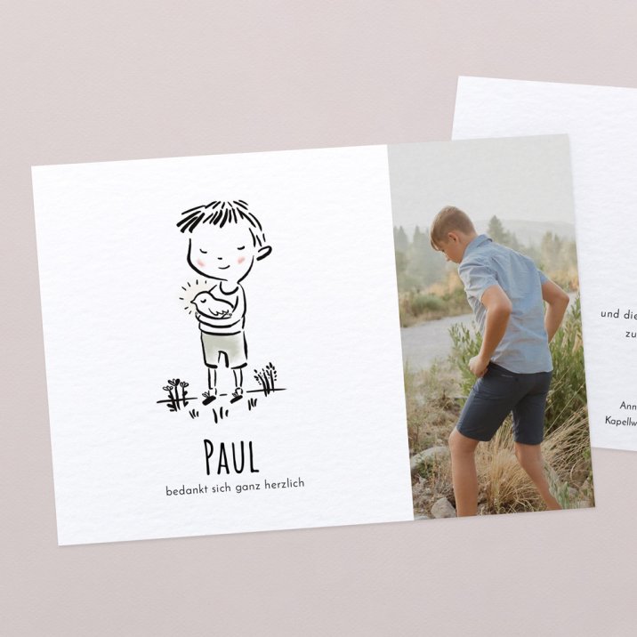 Gestalten Sie die Karte mit einem Gruß vom Kommunionskind und herzlichen Dankesworten, um so auf stilvolle Art und Weise "Danke" zu sagen.