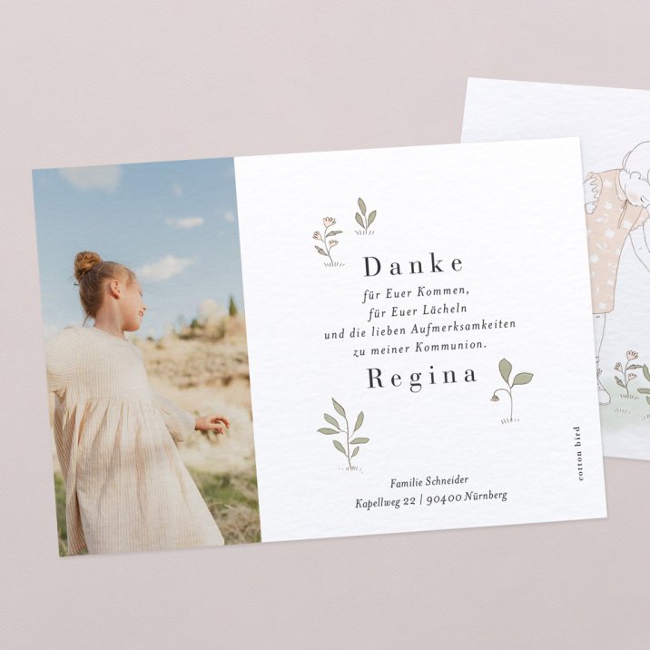 Gestalten Sie die Karte mit einem Gruß vom Kommunionskind und herzlichen Dankesworten, um so auf stilvolle Art und Weise "Danke" zu sagen.