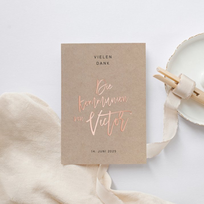 Gestalten Sie die Karte mit einem Gruß vom Kommunionskind und herzlichen Dankesworten, um so auf stilvolle Art und Weise "Danke" zu sagen.