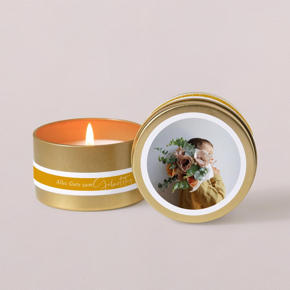 Die Kerze ist in eine elegante goldene Metalldose gegossen, die Sie individuell gestalten können. Ein perfektes Geschenk für jeden Anlass (und um sich selbst zu beschenken!).