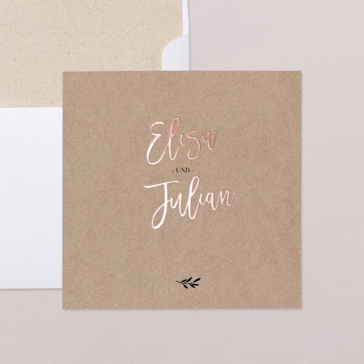 Die Einladungskarte Copper kombiniert den rustikalen Kraftpapier-Look mit romantischer Kupferveredelung und einem wunderschönen Schriftbild. Laden Sie Ihre Freunde und Familie mit dieser Karte zu einem unvergesslichen Hochzeitsfest ein.