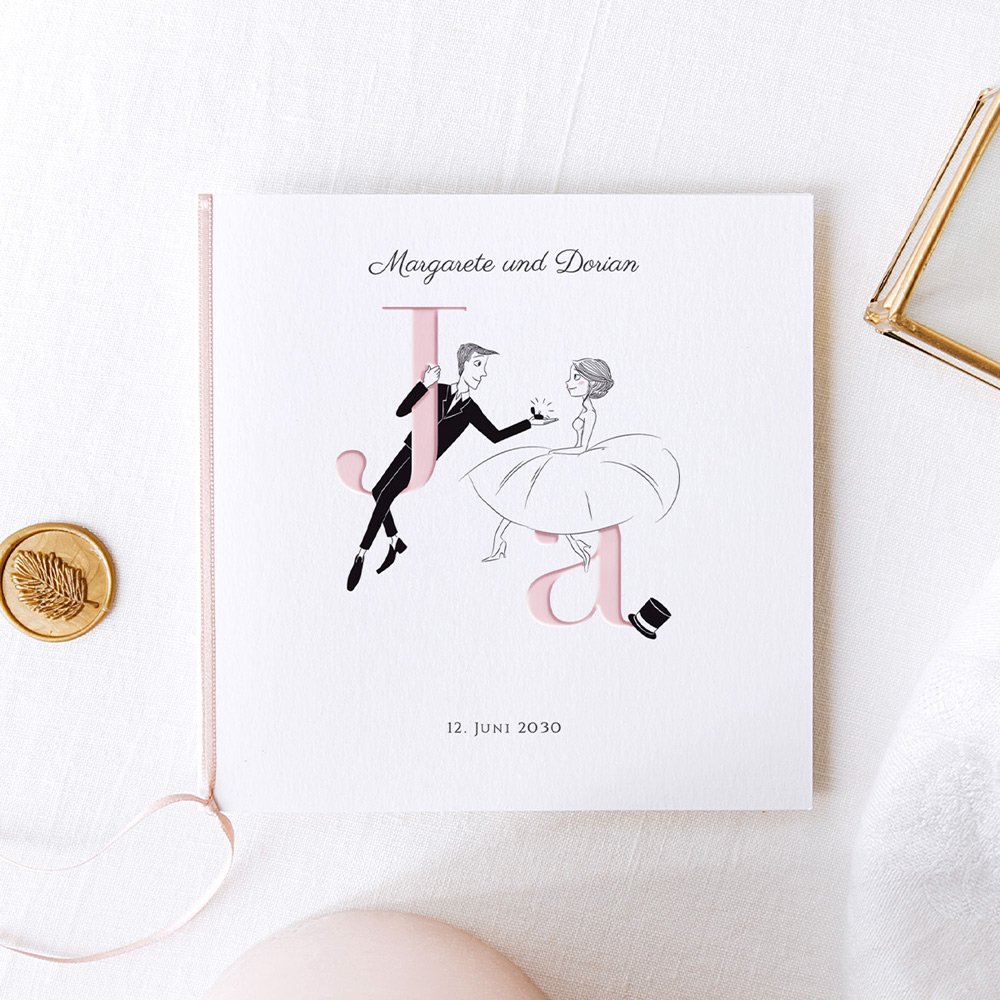 Bei dieser Einladungskarte haben unsere Designer sich von den magischen Momenten der Liebesbeziehung inspirieren lassen. Vom Verliebtsein, über den Augenblick, in dem er um ihre Hand angehalten hat, bis hin zum großen Tag des Ja-Worts. Die Karte fängt die Magie der Liebe mit ihrem süßen Motiv ein und weckt die Vorfreude auf ein unvergessliches Hochzeitsfest. Farblich passt die Einladung zu einer eleganten Hochzeit zu jeder Jahreszeit.