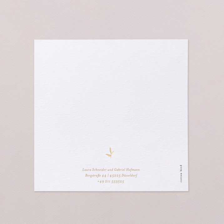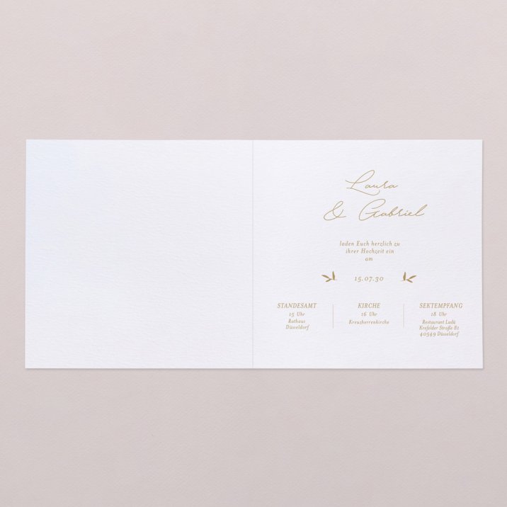 Das Format dieser quadratischen Hochzeitseinladung ist ein echter Klassiker - eine Klappkarte im Querformat, die Sie mit Ihrem Text gestalten können.