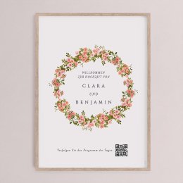 Ein poetischer Kranz aus rosafarbenen Blumen schmückt die Hochzeitseinladung Cottage. Diese zarte, farbenfrohe und frische Kreation ist ideal, um einen besonderen Tag mit einem ländlich-romantischen oder bohème-inspirierten Thema anzukündigen.