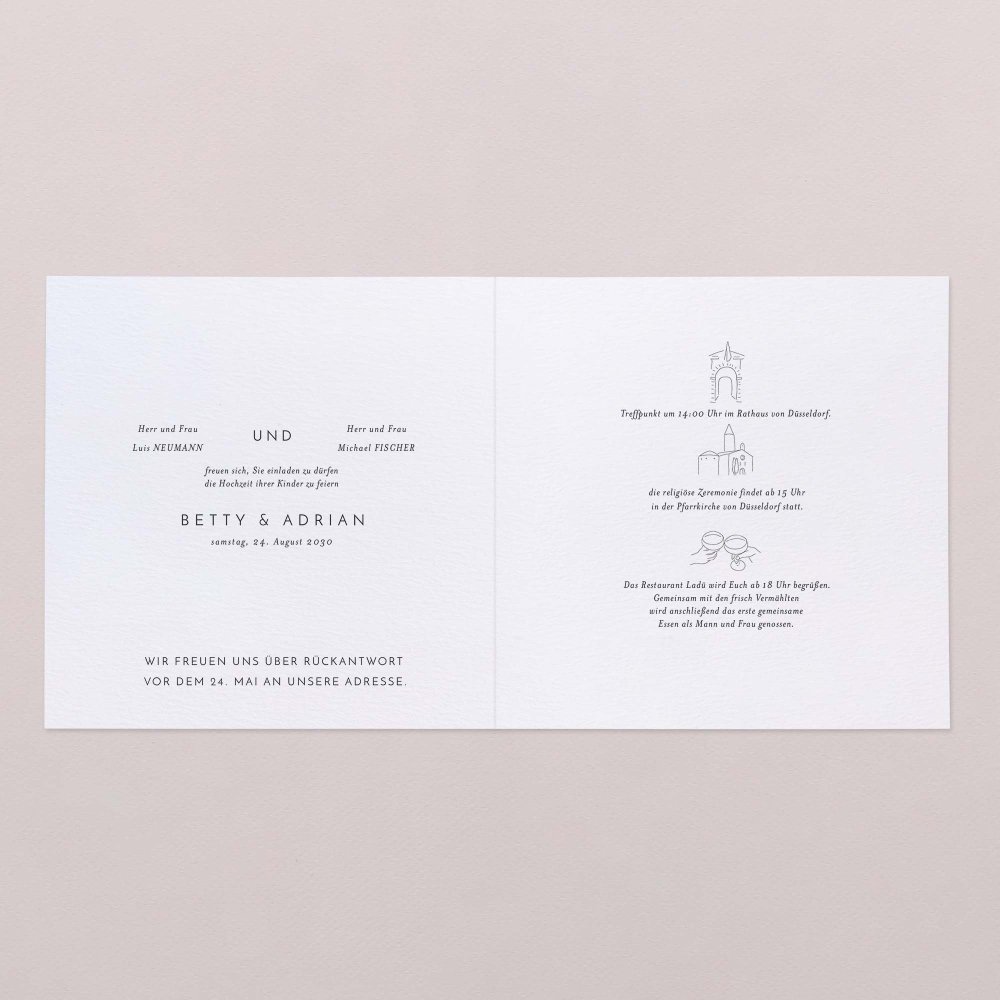 Das Format dieser quadratischen Hochzeitseinladung ist ein echter Klassiker - eine Klappkarte im Querformat, die Sie mit Ihrem Text gestalten können.