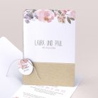Diese Hochzeitseinladung besteht aus einer Klappkarte im Hochformat mit sanft abgerundeten Ecken und einem runden Anhänger, der mit einem Deko Band an der Karte befestigt werden kann (Band als Accessoire bestellbar).