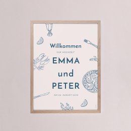 Die Hochzeitseinladung Roca Marina zeigt ein wunderschönes Bild mit mediterranem Flair. Zitrusfrüchte, Meeresfrüchte, zarte Blumenzweige und Besteck sind liebevoll skizziert und versprechen eine Tafel und Feierlichkeiten im sonnigen Süden.