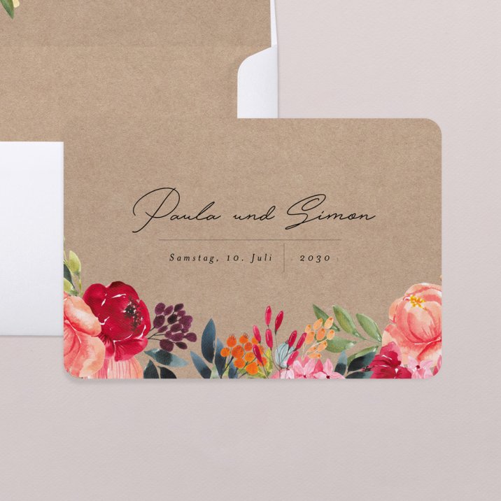 Ein üppiges Blumenmotiv in warmen Farben und der rustikale Kraftpapier Look machen diese Hochzeitseinladung zu einem besonderen Blickfang. Laden Sie Ihre Gäste mit dieser Karte zu einem romantischen Hochzeitsfest ein.