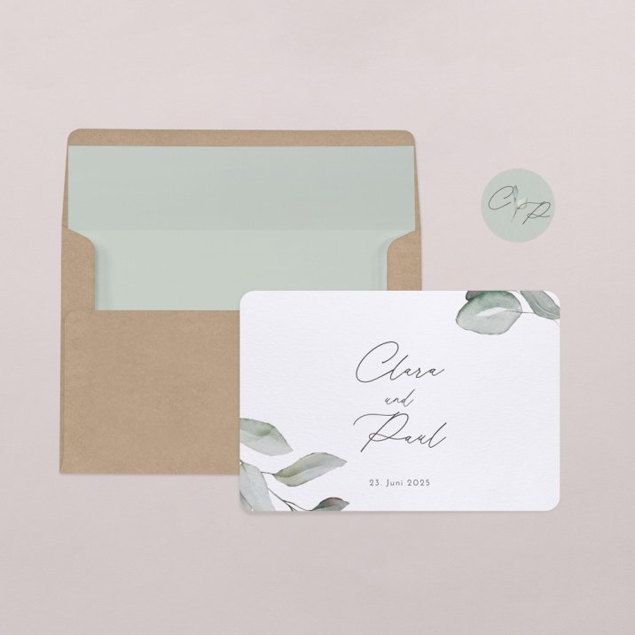 Diese Hochzeitseinladung verzaubert mit ihren mediterranen Eukalyptusblättern und reinem weißen Papier. Für Brautpaare, die sich auf ein natürliches und elegantes Fest freuen.