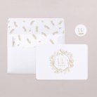 Der vergoldete Blütenkranz und die goldenen Initalen des Brautpaares machen die Hochzeitseinladung Orangerie zu einem echten Blickfang. Laden Sie Ihre Gäste mit dieser eleganten Karte zu einem stilvollen Hochzeitsfest ein.