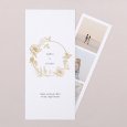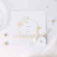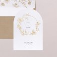 Auf der Hochzeitseinladung Carmen umrahmt ein wunderschöner, skizzierter Blumenkranz in Gold die Vornamen des Brautpaares. Eine raffinierte Komposition, die sich perfekt für eine rustikale oder schicke Hochzeit sowie für eine Feier im Boho-Stil eignet.