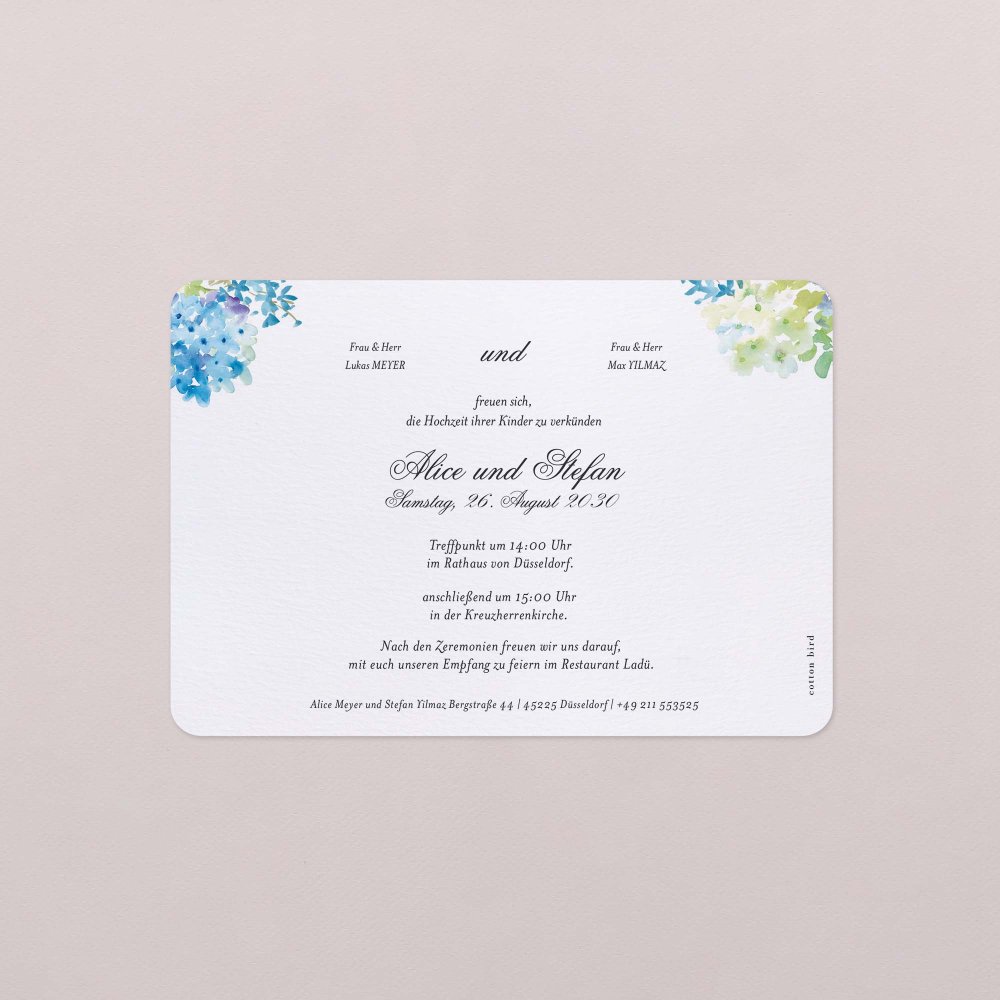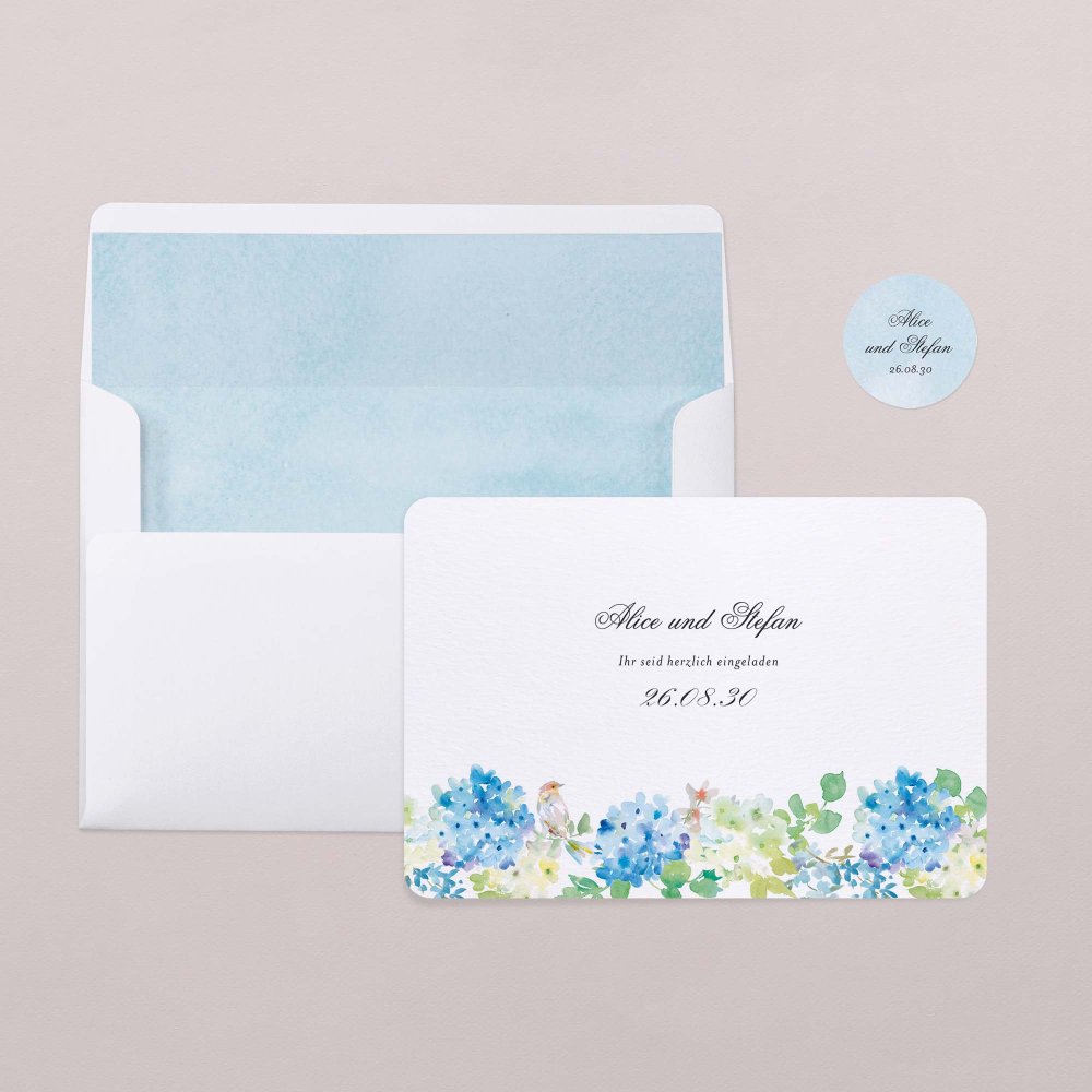 Ein zartes Aquarell findet sich auf der Hochzeitseinladung "Bird and Blue" wieder. Ein wunderschönes Bild aus blauen Blumen und Pflanzen, das sich ideal eignet, um mit poetischem Charme eine elegante, ländliche Feier anzukündigen.