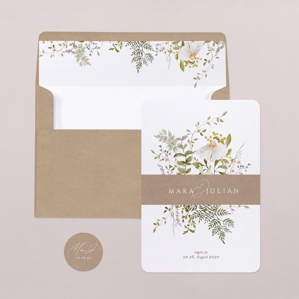 Ein Strauß aus Farnen, Gräsern und zarten Blumen ziert die Hochzeitseinladung Arpeggio. Kraftpapier und elegante Typografie vervollständigen diese von der Natur inspirierte Komposition, die perfekt zu einer Hochzeit mit natürlichem Thema passt.