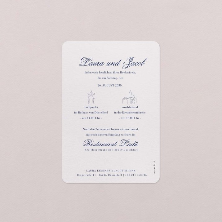 Schlicht und schön - diese Hochzeitseinladung im Hochformat hat weich abgerundete Ecken und ist beidseitig personalisierbar.