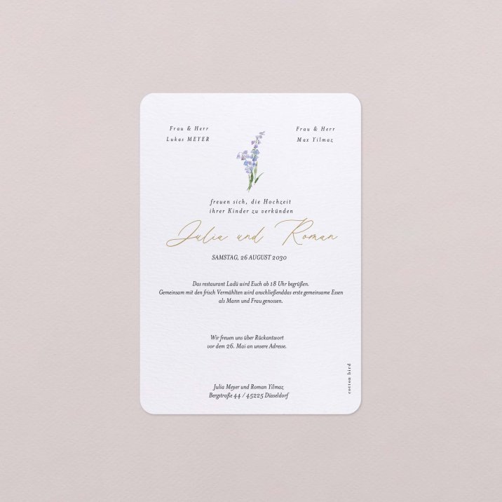 Schlicht und schön - diese Hochzeitseinladung im Hochformat hat weich abgerundete Ecken und ist beidseitig personalisierbar.