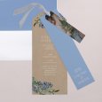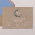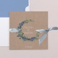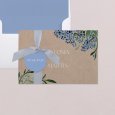 Ein Blumenbogen in verträumten Blautönen, die Vornamen des Brautpaares in raffinierter Typografie und authentischer Kraftpapier-Look: Die Hochzeitseinladung Azzura kündigt eine Hochzeitsfeier (auf dem Land) an, die Sie nicht verpassen sollten!