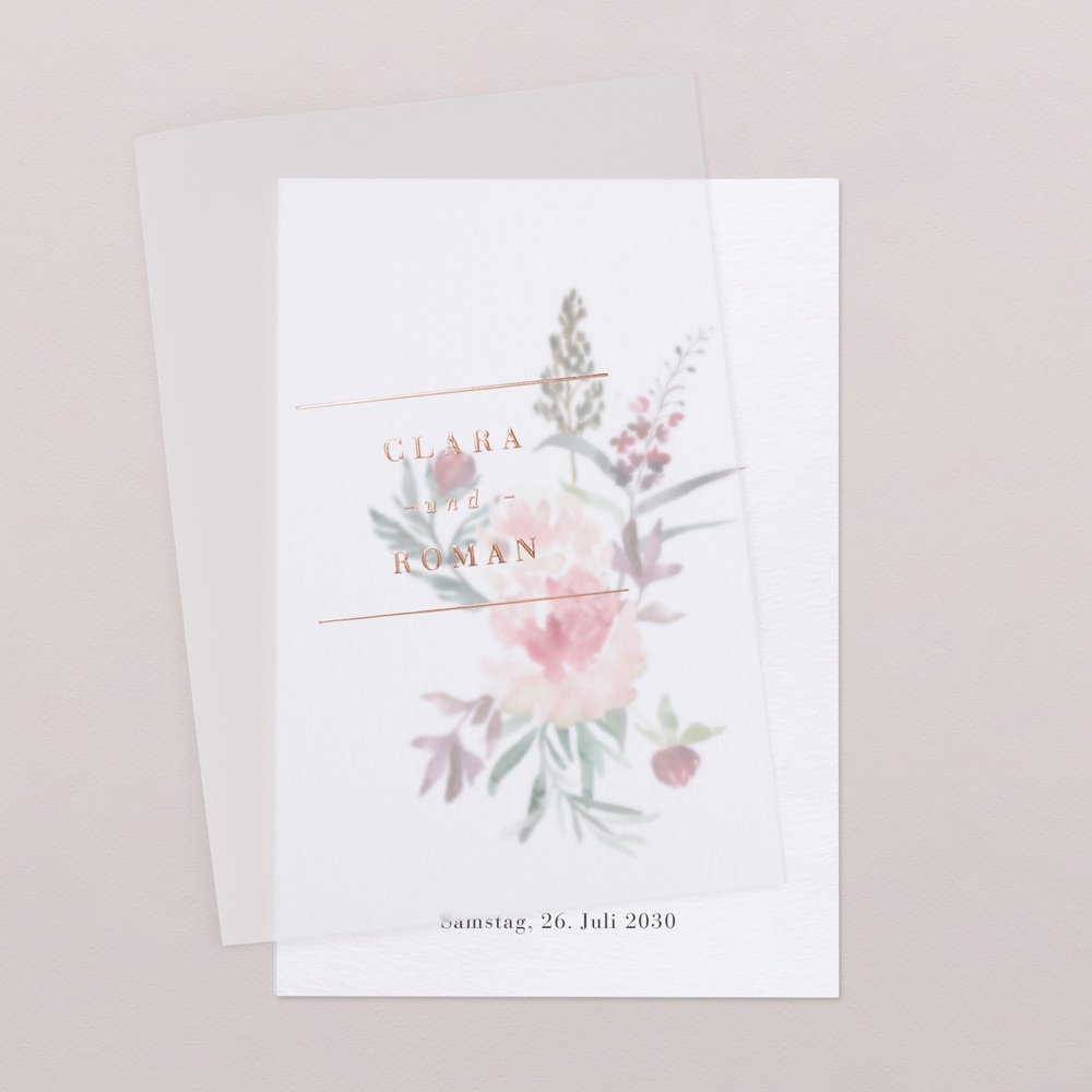 Eine elegante Hochzeitseinladung, die mit feiner Transparenz und edlem Kupfer verführt. Laden Sie Ihre Liebsten mit dem Modell Sommerblumen zu Ihrem Hochzeitsfest ein.