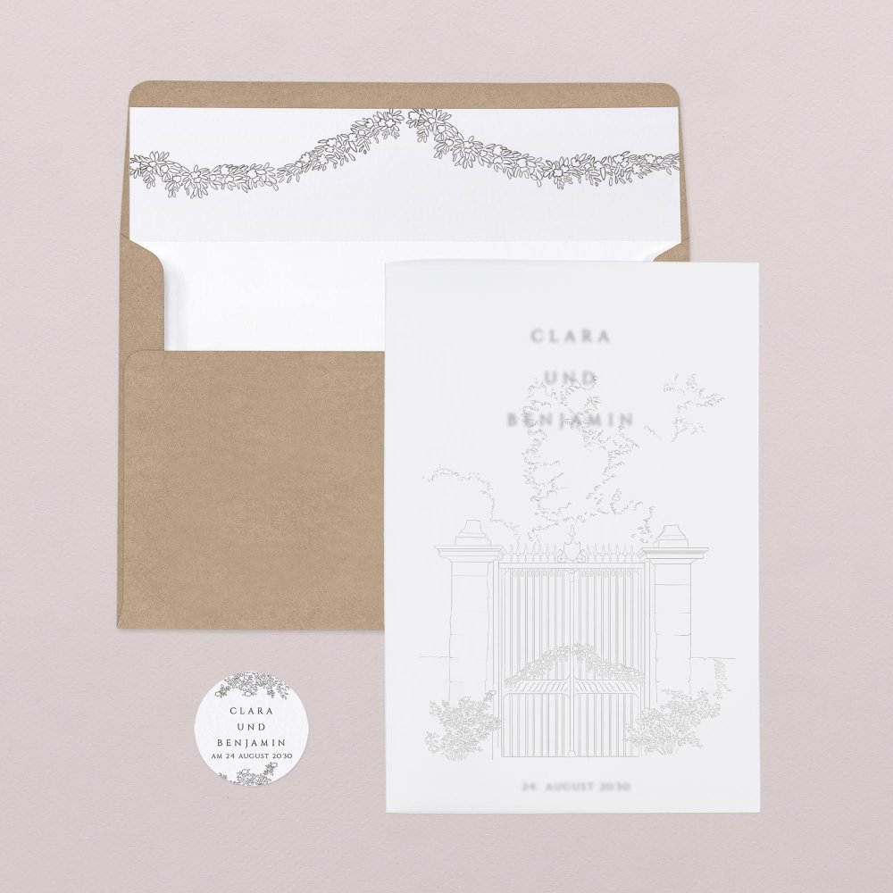 Einladung besteht aus einer Karte und einem feinen, illustrierten Transparentpapier.