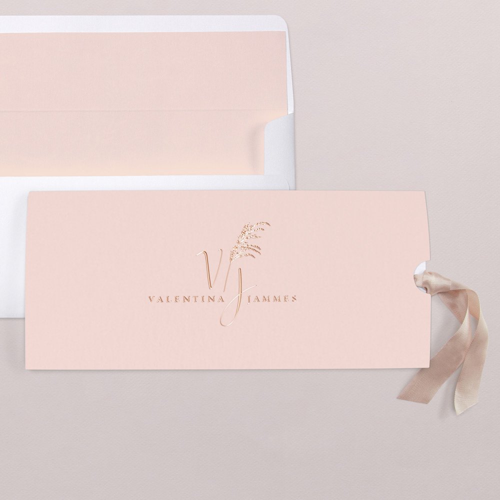 In Kupfer veredelt erstrahlen die Namen des Brautpaares auf der minimalistischen Hochzeitseinladung Blütenstaub. Laden Sie Ihre Lieben mit dieser Karte einen Vorgeschmack auf eine schicke und elegante Hochzeit.