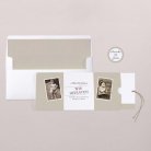 Weißt Du noch? Diese Hochzeitskarte ist wie ein Blick in ein altes Fotoalbum, bei dem Erinnerungen an gute alte Zeiten wach werden. Die Kinderfotos von Braut und Bräutigam machen diese Einladung zu etwas absolut Besonderem. Die Karte im klassischen Briefformat wird durch eine Banderole mit Letterpress-Text umschlossen und von einem kleinen Anhänger abgerundet. Für Brautpaare, denen Verbundenheit wichtig ist!