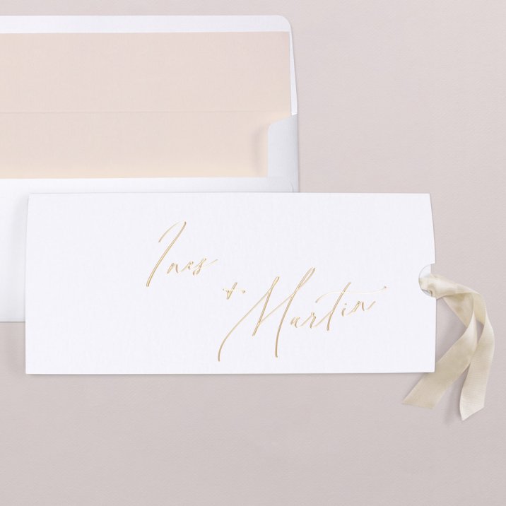 Eine schlichte und elegante Hochzeitseinladung veredelt durch Ihre Vornamen in Goldfolienprägung.Ihre Gäste werden das zarte Design des Modells Aurelia mit einem Hauch von Gold lieben.