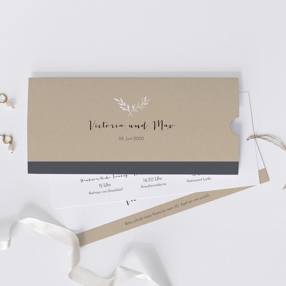 Die Einladungskarte Leopold überrascht mit einem mutigen Farbtrio aus Beige, Schiefer und Weiß. Die Kombination erdiger Farben mit klaren Linien und subtilen Ornamenten lässt die Karte elegant und klassisch wirken. Ideal für ein Hochzeitsfest in den Bergen oder auf einem Landsitz.