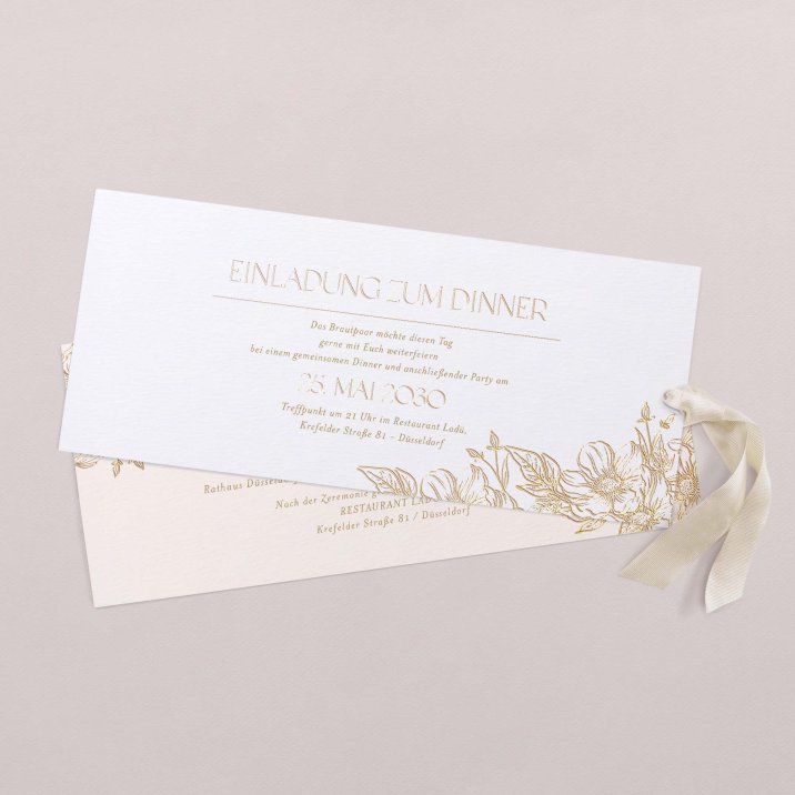 Einladung bestehend aus einer Kartenhülle und zwei Einsteckkarten. Einsteckkärtchen seitlich vorgestanzt, vorderseitig personalisierbar, Kartenrückseite weiß. Für zusätzliche Eleganz empfehlen wir, beide Karten mit einem schönen Band zusammenzubinden. Band nicht im Lieferumfang enthalten.