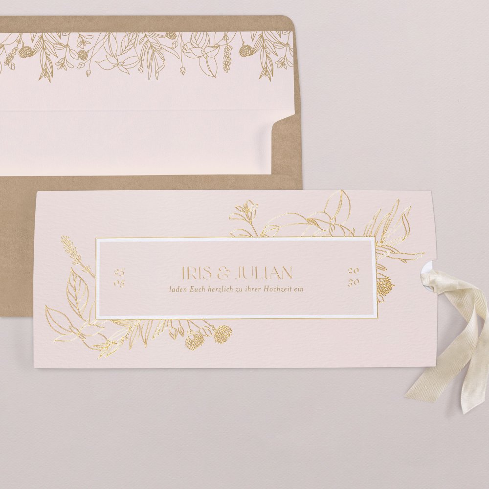 Die Ankündigung Ihres schönen Tages wird auf der Hochzeitseinladung Metropolitan mit Gold versehen. Pflanzenornamente, illustrierte Wildblumen und goldene Typografie treffen auf dieser Einladung aufeinander, ideal für eine Feier im ländlichen Chic.